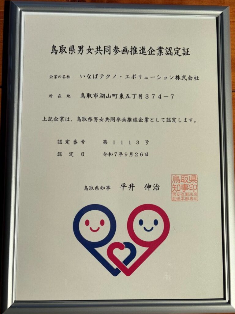 いなばテクノ・エボリューション株式会社は、このたび鳥取県より「男女共同参画推進企業」の認定を受けました。